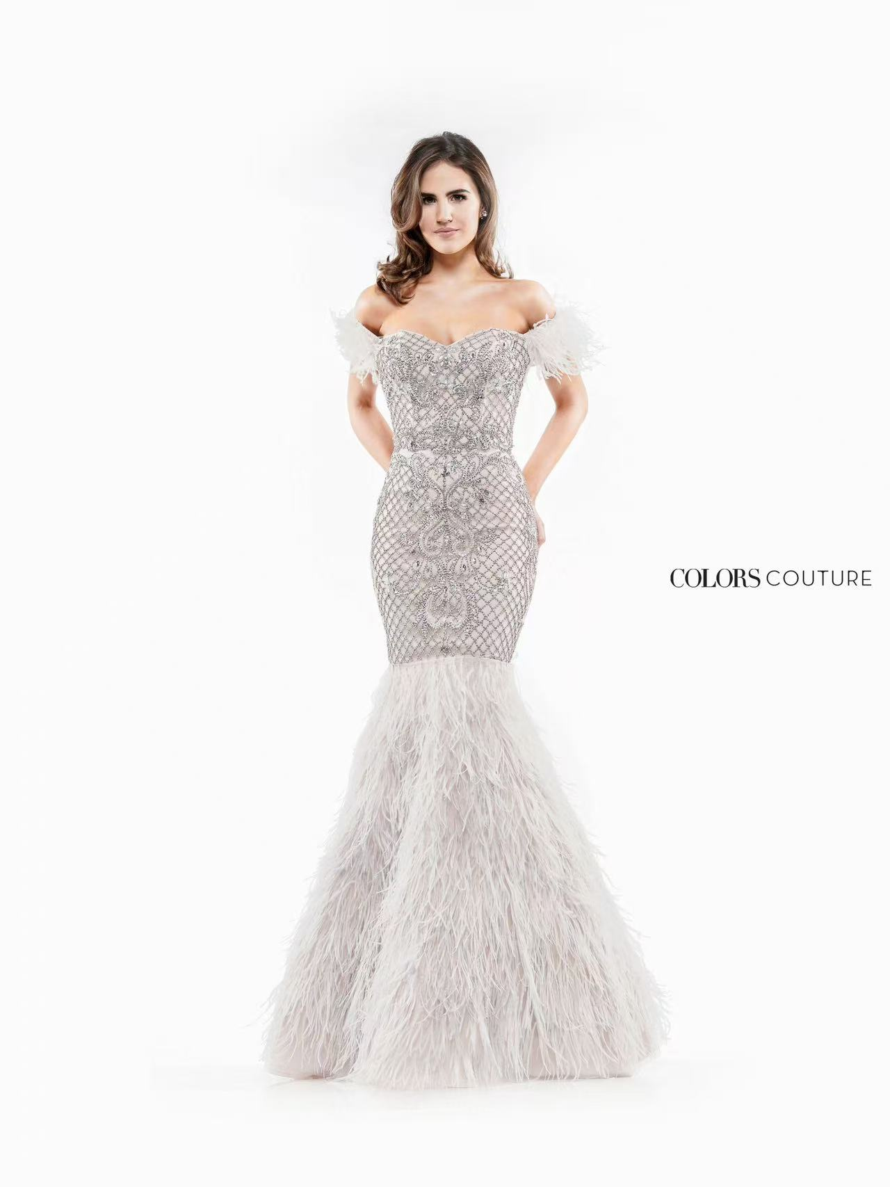 Command attention in this regal off-the-shoulder gown by COLORS COUTURE. Designed for the most glamorous occasions, this blush-toned masterpiece features a corset-style bodice adorned with intricate beadwork and delicate feather accents on the sleeves. The fitted silhouette flares into a voluminous feathered mermaid skirt, creating dramatic movement and couture elegance. Ideal for galas, red carpet events, and luxury weddings.