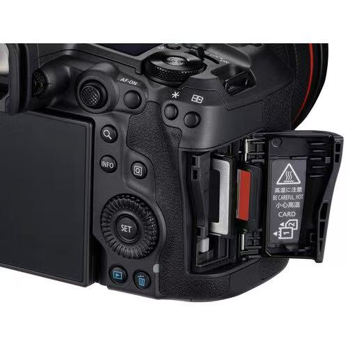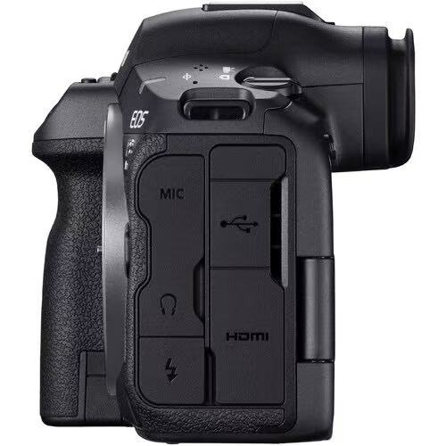 – Unlimited recording time; active cooling-fan grip optionalVideo – external: 4:2:2 10-bit 4K 60 fps via full-size HDMIViewfinder: 5.76 M-dot 0.5-inch OLED, 0.76×, 120 fps refresh, blackout-free optionRear monitor: 3.2-inch 2.1 M-dot vari-angle touch LCD + top status panelMedia slots: 1× CFexpress Type B (≥ VPG-400), 1× UHS-II SD (V90 recommended)Connectivity: Wi-Fi 6 (2.4/5/6 GHz), Bluetooth 5.0, USB-C 3.2 Gen 2 (data/power), full HDMI, 3.5 mm mic & headphone, PC-sync, Canon N3 remote, GPS via smartphoneBattery: LP-E6P (also accepts LP-E6NH / LP-E6N); CIPA 340 shots (EVF) / 630 shots (LCD)Dimensions / weight: ≈ 138.4 × 98.4 × 88.4 mm, ≈ 670 g (body-only, with battery & card)Other: In-camera 179 MP neural up-scaling, neural noise-reduction, Canon Log 2/3, HDR-PQ/HLG, no built-in ND, no built-in flash, magnesium-alloy weather-sealed body.